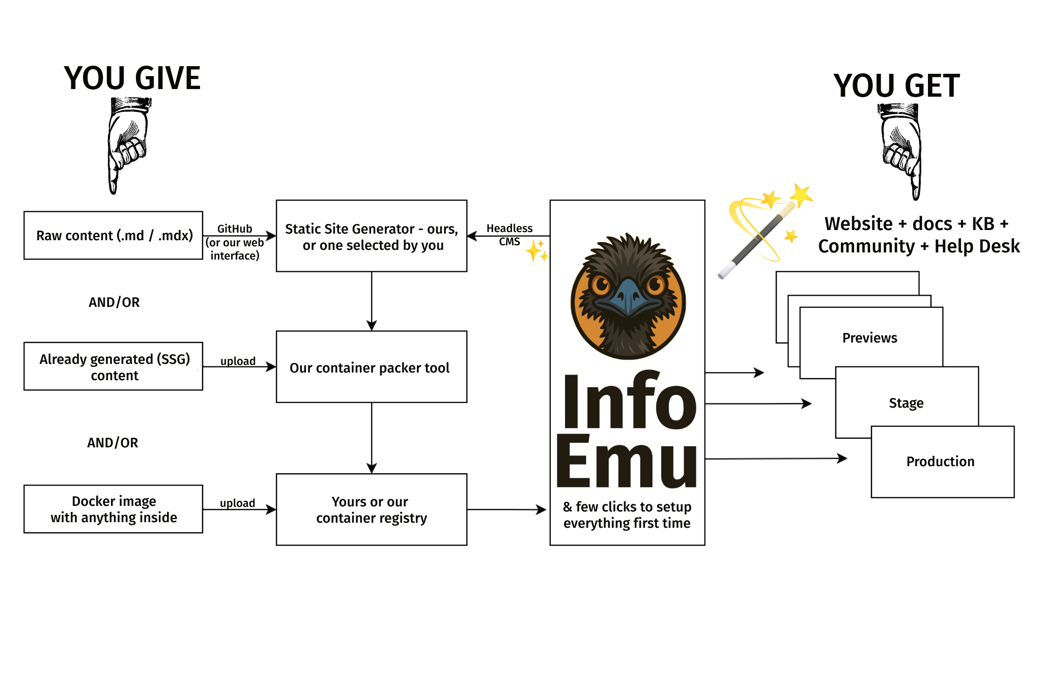 Headless CMS + RBAC + Auth at the core. Automatic deployment to any cloud provider. Easily build landing page, blog, store, or whatever you need. Next.js or any other framework and stack you want. You create content, rest comes out of the box.